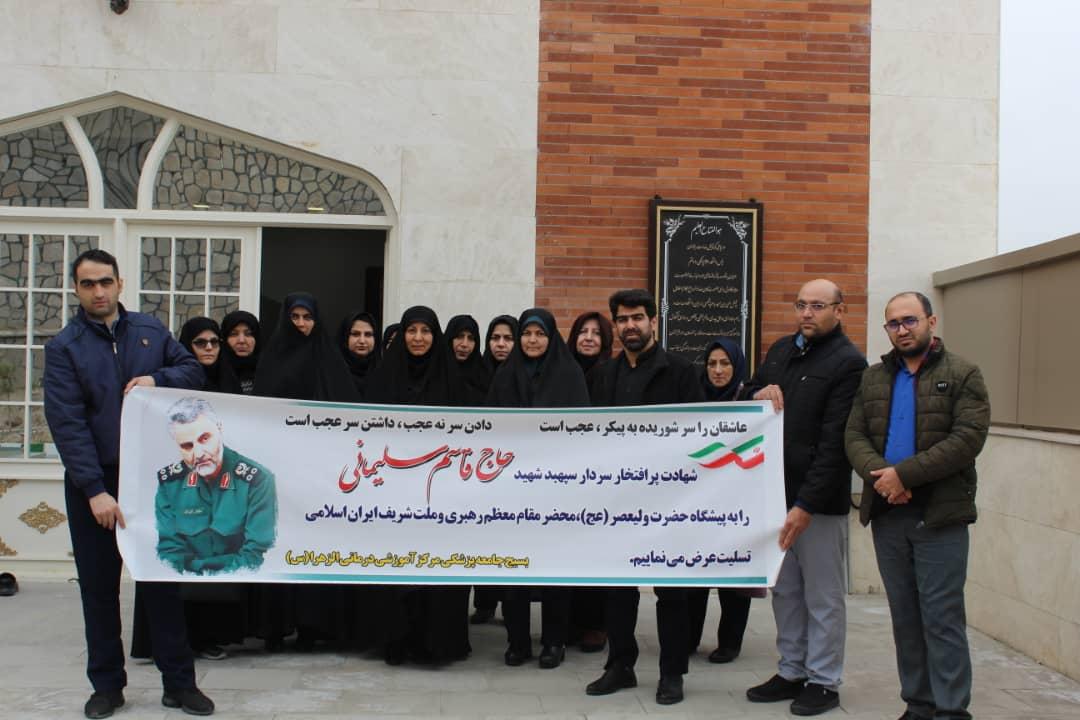 روز شنبه مورخ 99/10/13 خانم دکتر مریم واعظی ریاست محترم مرکز آموزشی پژوهشی درمانی الزهرا (س) به همراه جمعی از بسیجیان و پرسنل محترم مرکز در مراسم اولین سالگرد شهادت سرداری که با بالهای شهادت به ملا اعلی عروج کرد که زمین،سنگینی قدم هایش را برگرده خو می فهمید و آسمان به سایه اش بر سر او می بالید.سرداری که در معرفت و سلوک غبطه عارفان و سالکان را بر می انگیخت و در هوش و کیاست و فراست،رشک برجسته ترین طراحان و سیاستمداران جهان و در شجاعت و رشادت،حیرت بی باک ترین دلیران و جنگاوران. بود ،شرکت کرده و ضمن ادای احترام به مقام تمامی شهدای والامقام میهن عزیزمان بر ادامه راه شهدای مقاومت از جمله ولایت مداری تاکید کردند.
