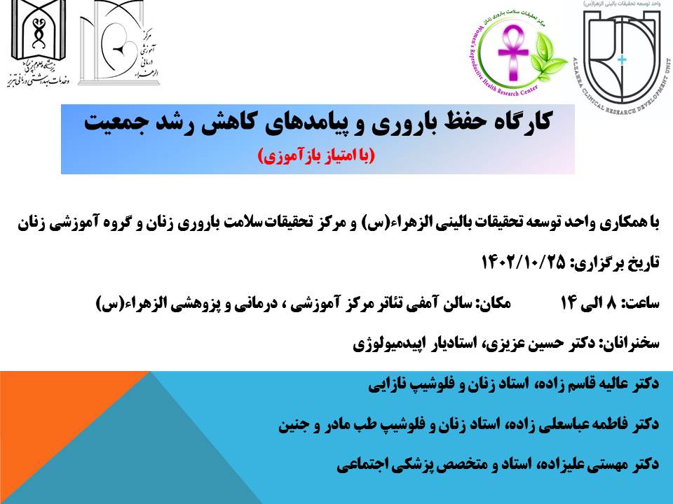 | 2 | کارگاه حفظ باروری و پیامدهای کاهش رشد جمعیت با مشارکت واحد توسعه تحقیقات بالینی مرکز ، مرکز تحقیقات سلامت باروری زنان و گروه آموزشی زنان | 1402/10/25 | دکتر حسین عزیزی دکتر عالیه قاسم زاده دکتر فاطمه عباسعلیزاده دکتر مهستی علیزاده |