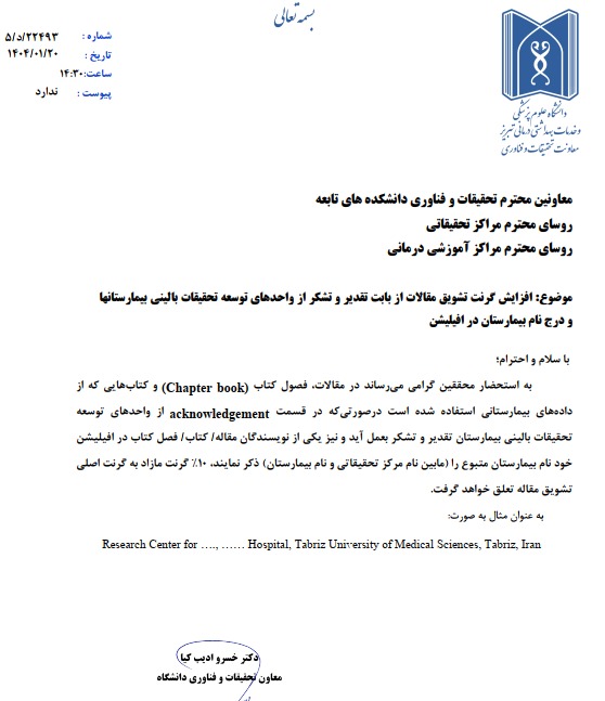 عطف به نامه شماره 22493د/5 در تاریخ 20/ 01/ 1404 چنانچه در مقالات، فصول کتاب(Chapter book) و کتابهایی که از دادههای بیمارستان استفاده شده است، تقدیر و تشکر از واحدهای توسعه تحقیقات بالینی بیمارستان در بخش Acknowledgement به عمل آید و نیز یکی از نویسندگان مقاله/کتاب/فصل کتاب در افیلیشن خود نام بیمارستان متبوع را (مابین نام مرکز تحقیقاتی و نام بیمارستان) ذکر نمایند، 10% گرنت مازاد به گرنت اصلی تشویق مقاله از طرف معاونت تحقیقات دانشگاه علوم پزشکی تبریز تعلق خواهد گرفت.